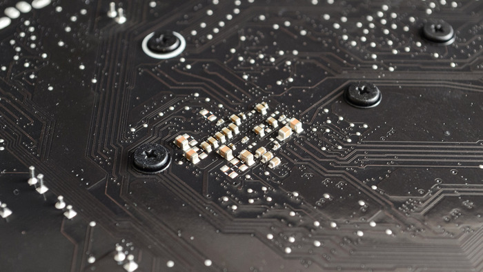 Если снять все радиаторы, то видно, что плата имеет простой дизайн, где украшательствами служат лишь диагональные полосы белого цвета.