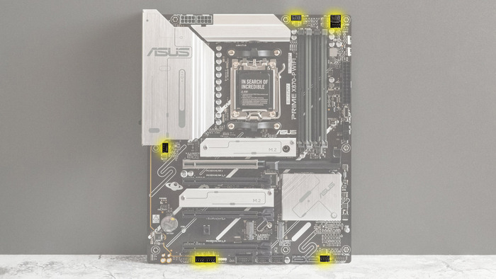 На материнской плате ASUS Prime X870-P WIFI есть в общей сложности семь 4-pin разъемов для подключения системы охлажения: один для помпы СЖО, пара для процессорного кулера или вентиляторов на радиаторе СЖО и четыре для корпусных вентиляторов.