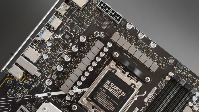 Система питания процессора у ASUS Prime X870-P WIFI выглядит как 14+2+1 (VCore + SOC + Misc). Все фазы построены на сборках Vishay SIC629 (80 А), которые и управляются ШИМ-контроллером Digi+ ASP2208 (VCore + SOC). и Richtek RT3672EE (Misc) – находится на тыльной стороне платы.