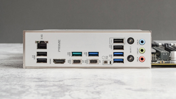 Задняя панель ввода-вывода главным образом несет на себе разъемы USB разных ревизий: пара USB 4 в форм-факторе type C (до 40 Гбит/с с поддержкой DisplayPort 1.4a), один (зеленый) USB 3.2 Gen2 (до 10 Гбит/с), три (синие) USB 3.2 Gen1 (до 5 Гбит/с) и целых четыре USB 2.0, один из которых имеет поддержку BIOS FlashBack. Классический видеовыход только один – HDMI 2.1, но есть DP через USB-C. Кроме россыпи USB здесь есть разъем RJ-45 (8P8C) для сетевого кабеля, пара выводов для антенны WI-FI и тройка аудиовыходов jack 3.5.