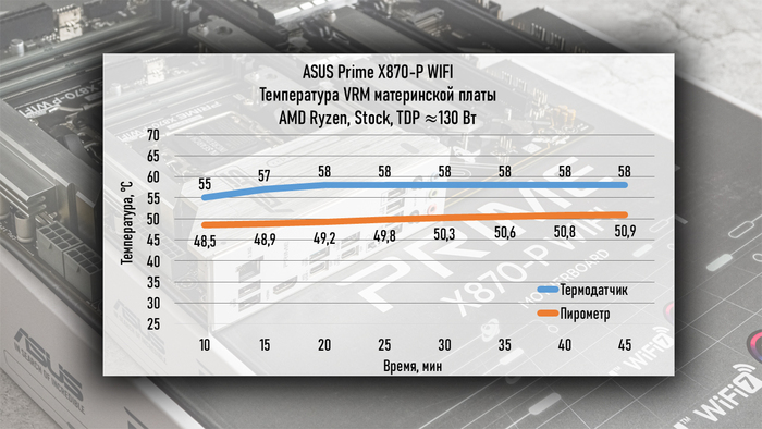 Важно отметить, что плата не имела дополнительного обдува и лежала горизонтально. Такое положение и конструкция радиаторов не способствуют хорошему охлаждению без принудительной вентиляции. В реальных условиях, внутри корпуса с хотя бы одним вентилятором, температура VRM была бы еще ниже. Кроме того, обычные задачи редко создают такую же нагрузку, как Prime95.