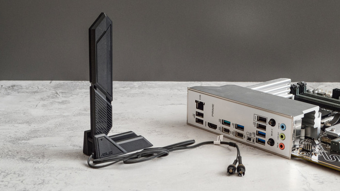 Как и говорилось раньше, на задней панели платы есть разъёмы для антенны, которая идёт в комплекте. Её коннекторы (Q-Antenna) соединяются быстро: их нужно просто нажать до щелчка, а не закручивать, как классические RP-SMA. Основание у антенны на магните, поэтому её можно легко прикрепить к металлической стенке системного блока.