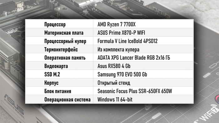 Сборка для теста была собрана на открытом стенде. В основе — процессор AMD Ryzen 7 7700X и оперативная память ADATA XPG Lancer Blade RGB объемом 2x16 ГБ. Для охлаждения процессора использовался кулер Formula V Line IceBold 4PSD12, при этом его вентилятор был направлен так, чтобы не обдувать цепи питания. Это позволило сделать тест более объективным.