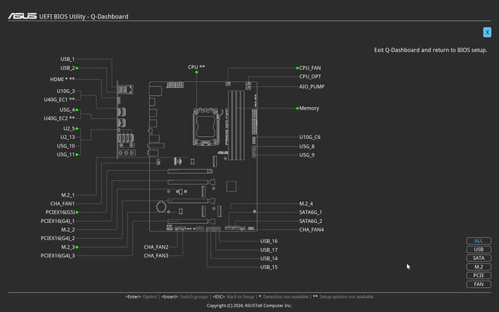 Одной из полезных функций является инструмент Q-Fan Control, предоставляющий удобный графический интерфейс для настройки работы системы охлаждения. С его помощью можно гибко регулировать кривые вращения вентиляторов простым перетаскиванием контрольных точек на графике. Еще из любопытного здесь Q-Dashboard – схематичное и наглядное отображение всех разъемов на плате. Своего рода краткий мануал-шпаргалка внутри BIOS. Будет полезно для начинающих энтузиастов.