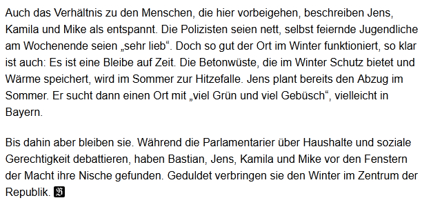 Отношения с людьми, которые здесь проходят, Йенс, Камила и Майк также описывают как спокойные. Полицейские, говорят они, вежливые, даже празднующие по выходным молодые люди — «очень милые». Но как бы хорошо это место ни работало зимой, ясно и то, что это временное пристанище. Бетонная пустыня, которая зимой обеспечивает защиту и сохраняет тепло, летом превращается в жаркую ловушку. Йенс уже планирует уехать летом. Он ищет место с «много зелени и кустарников», возможно, в Баварии.