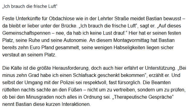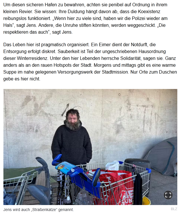 Постоянных приютов для бездомных, как на Лертерштрассе, Бастиан сознательно избегает — он предпочитает оставаться под мостом. «Мне нужен свежий воздух», — говорит он. «На эту общую ночлежку — нет, у меня нет на это желания». Здесь у него есть своё постоянное место, свой покой и автономия. В это понедельничное утро Бастиан уже собрал десять евро за сдачу тары, его немногочисленные пожитки надежно убраны на его месте.