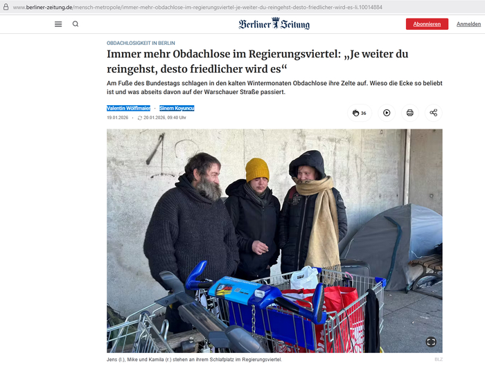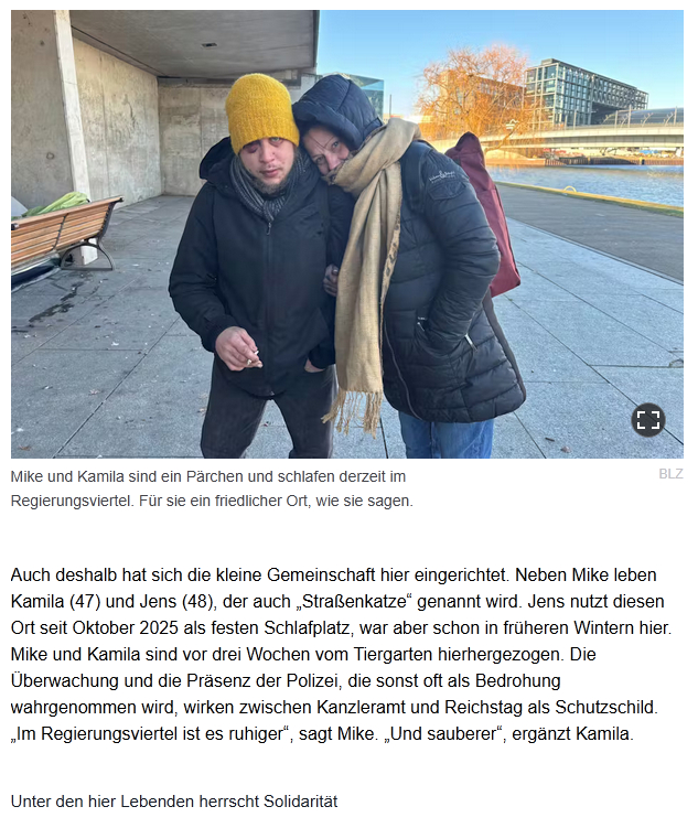 Поэтому же здесь и обосновалась небольшая община. Помимо Майка, здесь живут Камила (47) и Йенс (48), которого также зовут «уличным котом». Йенс использует это место как постоянное спальное место с октября 2025 года, но бывал здесь и в прежние зимы. Майк и Камила перебрались сюда из Тиргартена три недели назад. Наблюдение и присутствие полиции, которые в других местах часто воспринимаются как угроза, здесь, между канцелярией и рейхстагом, действуют как щит. «В правительственном квартале тише», — говорит Майк. «И чище», — добавляет Камила.