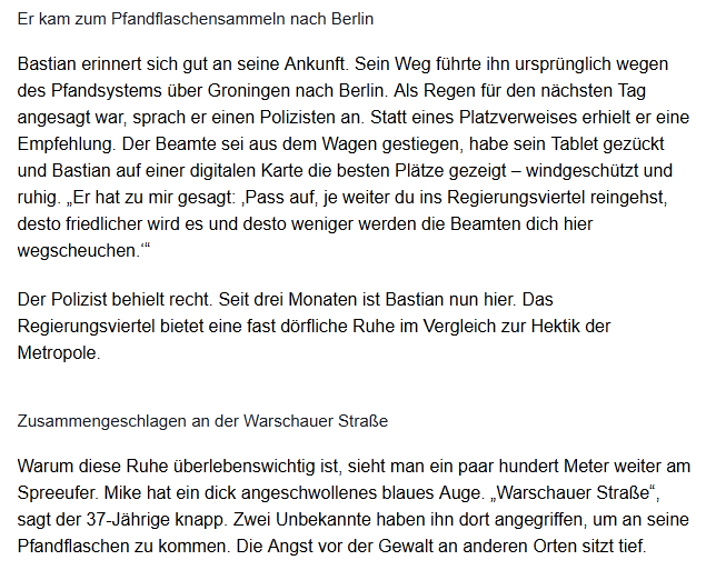 Бастиан хорошо помнит свой приезд. Его путь из-за системы залоговых бутылок изначально привел его через Гронинген в Берлин. Когда на следующий день обещали дождь, он обратился к полицейскому. Вместо предписания покинуть место он получил рекомендацию. Офицер вышел из машины, достал планшет и показал Бастиану на цифровой карте лучшие места — защищенные от ветра и спокойные. «Он сказал мне: „Смотри, чем дальше в правительственный квартал заходишь, тем спокойнее становится и тем меньше полицейские будут тебя здесь гонять“».