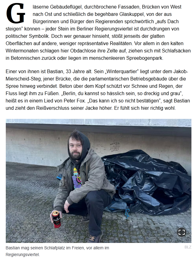 Стеклянные крылья зданий, пронизанные фасады, мосты с запада на восток и, наконец, стеклянный купол, по которому граждане могут буквально «подняться на крышу» к правителям, — каждый камень в берлинском правительственном квартале пронизан политической символикой. Однако тот, кто присмотрится внимательнее, за глянцевыми фасадами обнаружит иные, менее презентабельные реалии. Особенно в холодные зимние месяцы здесь разбивают палатки бездомные, укрываются спальными мешками в бетонных нишах или лежат в безлюдном парке Шпреебоген.