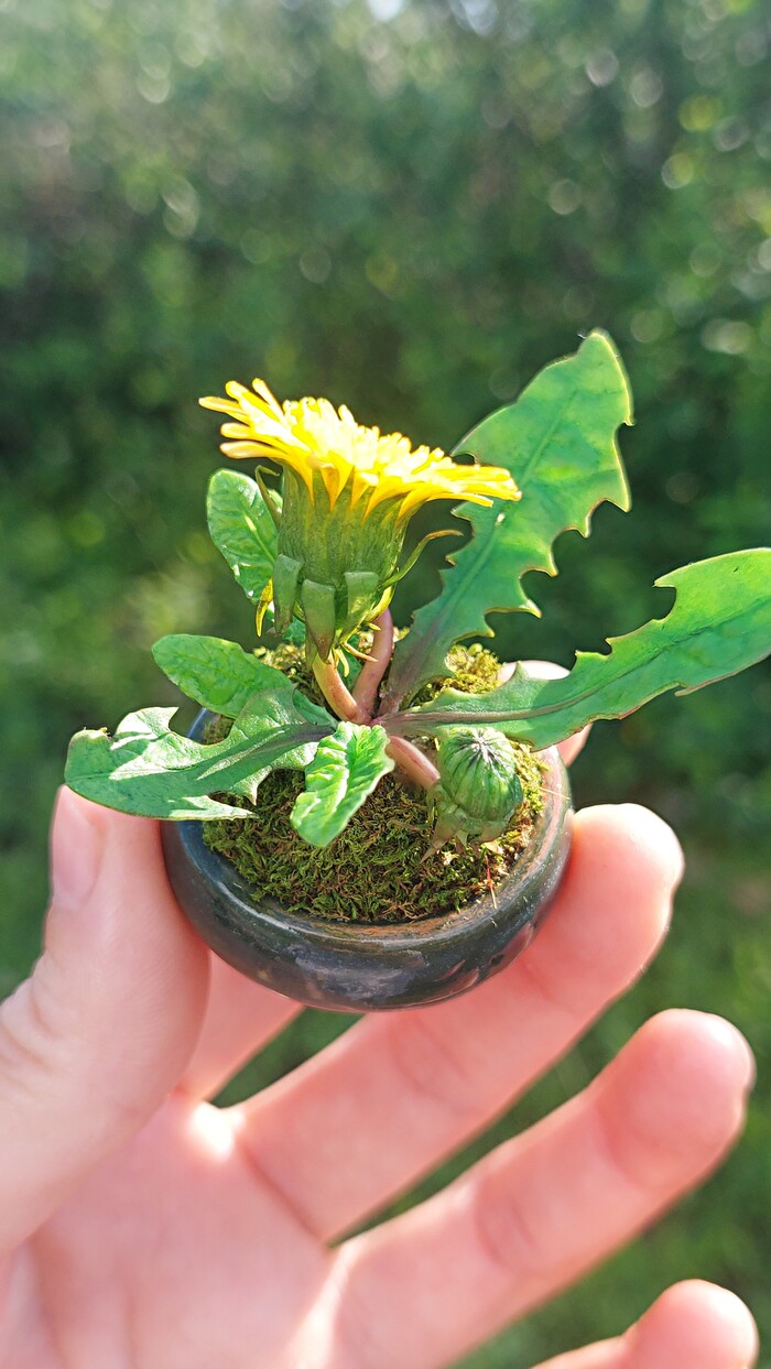 Не знаю, правильно ли данную композицию называть бонсай, но уж очень захотелось попробовать слепить и "посадить" одуванчик в мини кашпо с мхом)