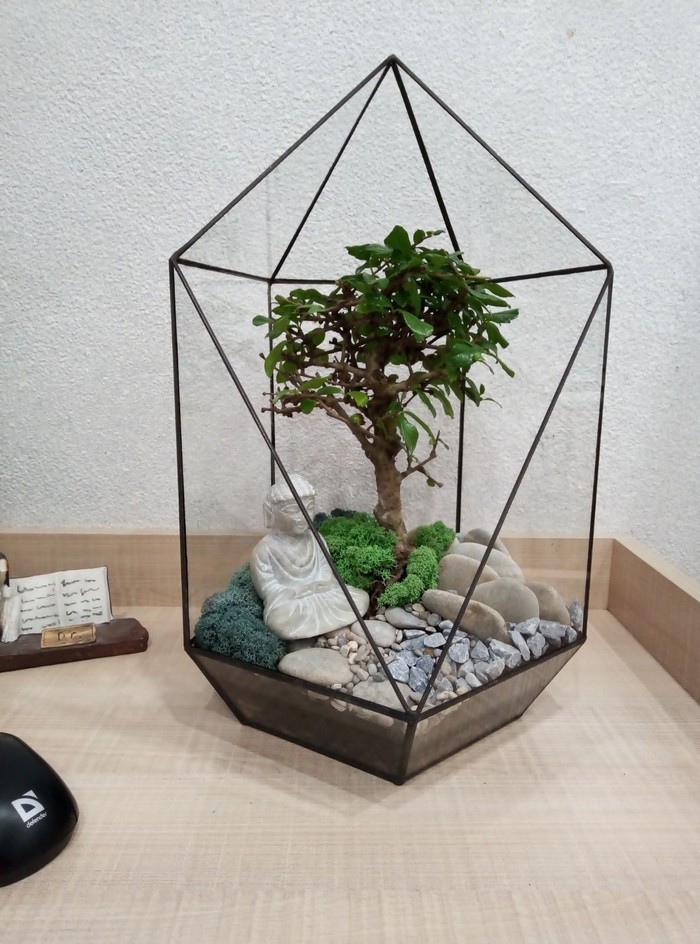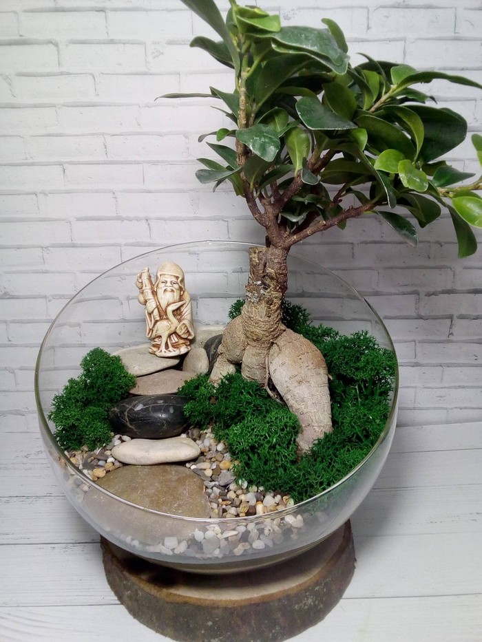 В продолжение поста о флорариумах и новой профессии выкладываю фотографии сибирской вариации на тему японского искусства создания деревьев бонсай. Будда тут немного не в тему, но у наших заказчиков весьма разные вкусы.