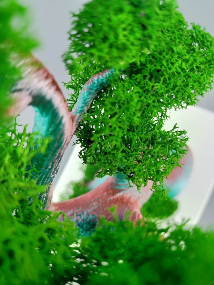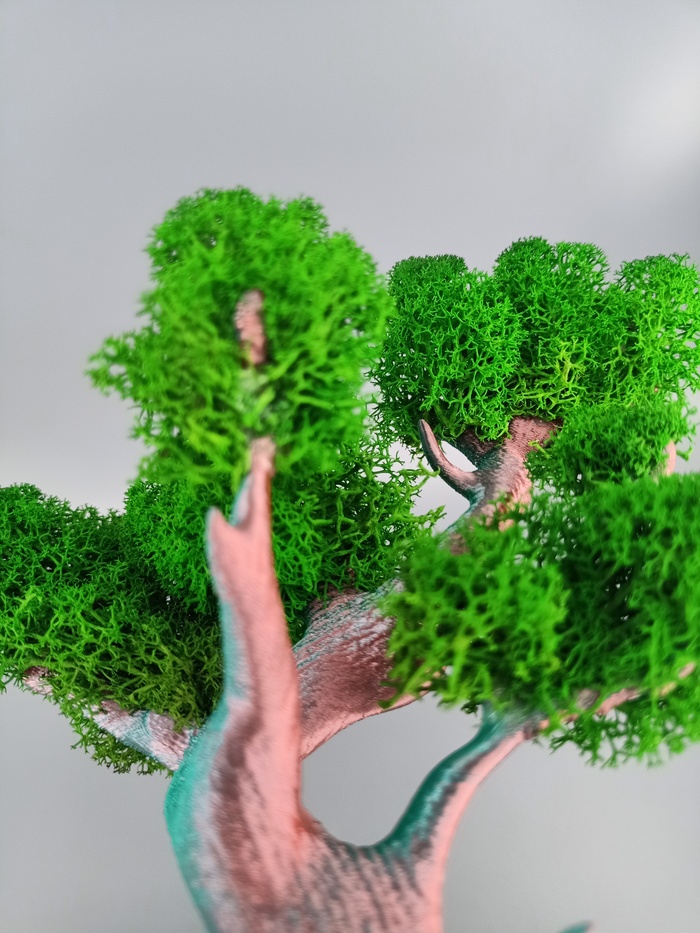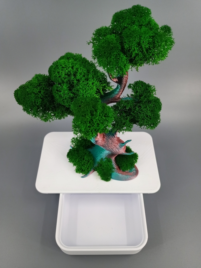 Шкатулка и основа дерева напечатаны на 3D принтере из пластика марки PLA. Собрана конструкция на термо-сопли термо-клей. Мох - стабилизированный ягель. Было в нем немного мусора, но пинцет прекрасно с этим справился. Работала в перчатках, ибо, судя по отзывам, краска мха отмывается с бооольшим трудом.