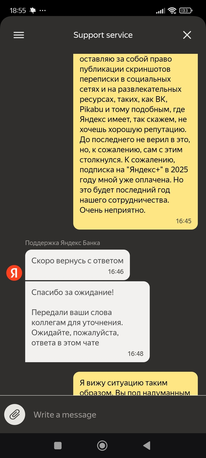 Я: "В таком случае, учитывая Вашу клиентоориентированность, оставляю за собой право публикации скриншотов переписки в социальных сетях и на развлекательных ресурсах, таких, как ВК, Pikabu и тому подобным, где Яндекс имеет, так скажем, не очень хорошую репутацию. До последнего не верил в это, но, к сожалению, сам с этим столкнулся. К сожалению, подписка на "Яндекс+" в 2025 году мной уже оплачена. Но это будет последний год нашего сотрудничества. Очень неприятно."