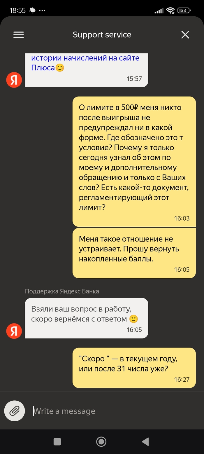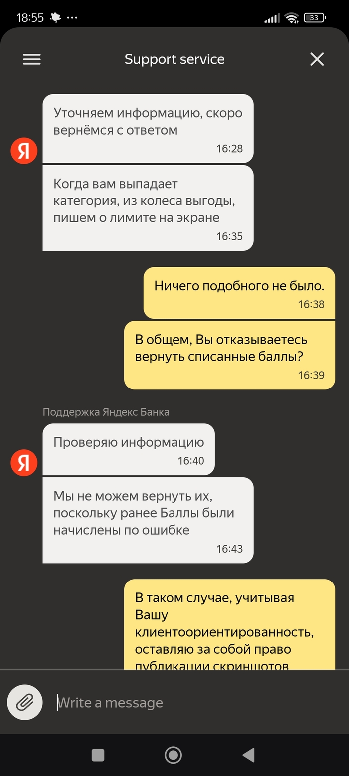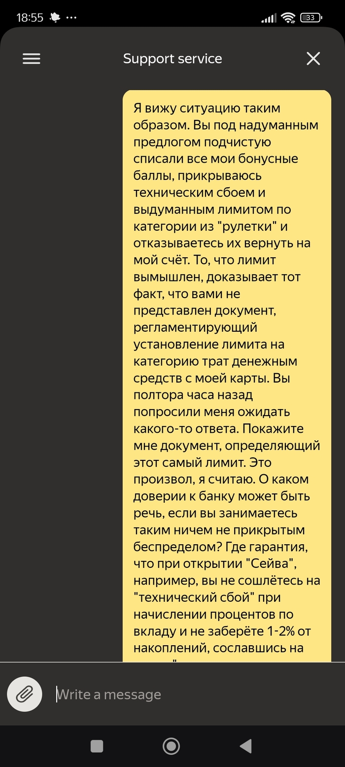 Я: "Я вижу ситуацию таким образом. Вы под надуманным предлогом подчистую списали все мои бонусные баллы, прикрываюсь техническим сбоем и выдуманным лимитом по категории из "рулетки" и отказываетесь их вернуть на мой счёт. То, что лимит вымышлен, доказывает тот факт, что вами не представлен документ, регламентирующий установление лимита на категорию трат денежным средств с моей карты. Вы полтора часа назад попросили меня ожидать какого-то ответа. Покажите мне документ, определяющий этот самый лимит. Это произвол, я считаю. О каком доверии к банку может быть речь, если вы занимаетесь таким ничем не прикрытым беспределом? Где гарантия, что при открытии "Сейва", например, вы не сошлётесь на "технический сбой" при начислении процентов по вкладу и не заберёте 1-2% от накоплений, сославшись на некое "всплывающее сообщение" при оформлении вклада?"