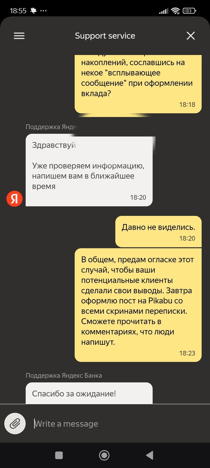 Я. Банк: "Здравствуйте! Уже проверяем информацию, напишем вам в ближайшее время"