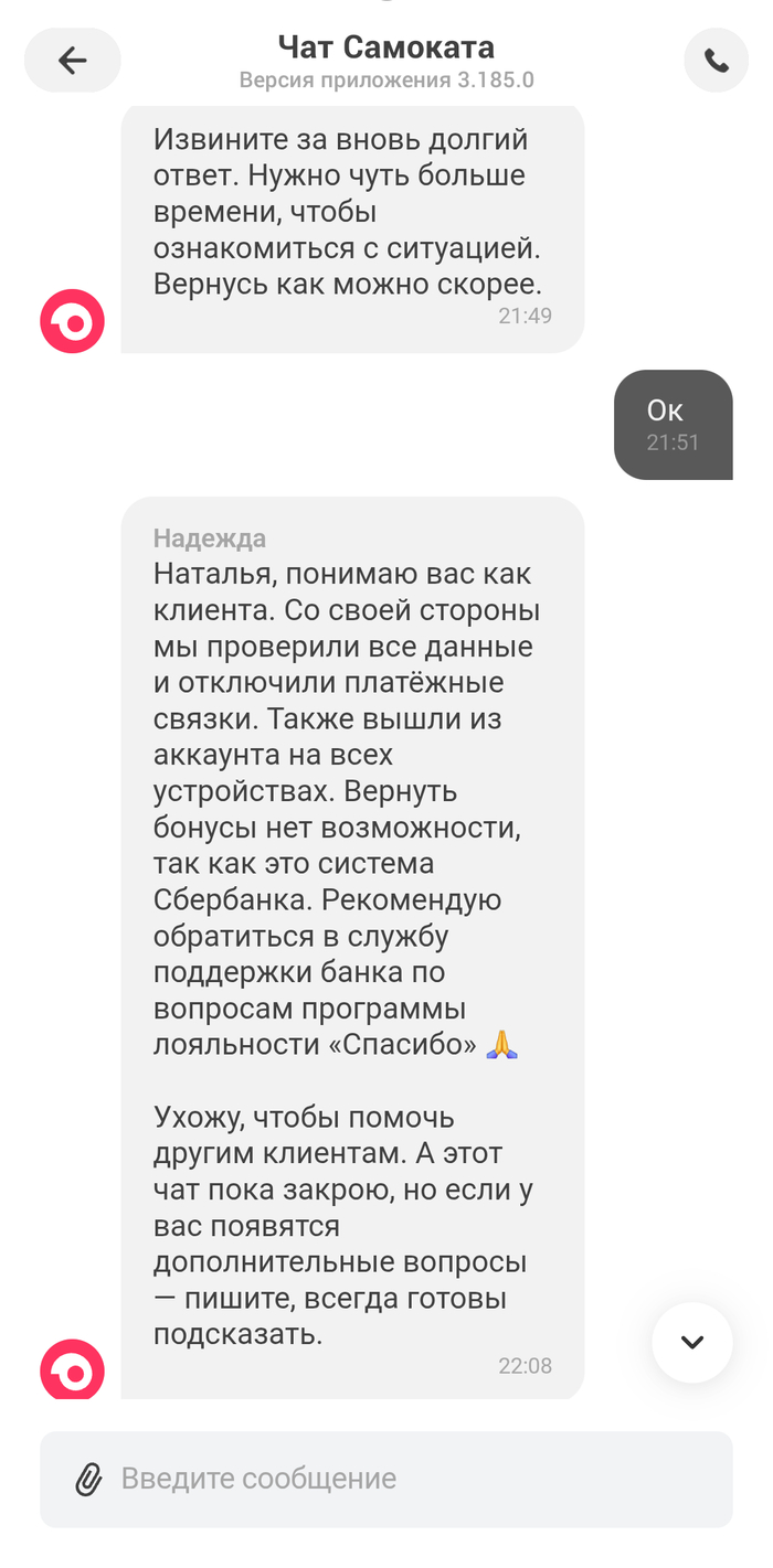Я. Банк: "Спасибо за ожидание! Видим, что коллеги ещё работают по вашему вопросу. Сразу же вернёмся прямо в этот чат, как только появятся новости. Пожалуйста, ожидайте 🙏"