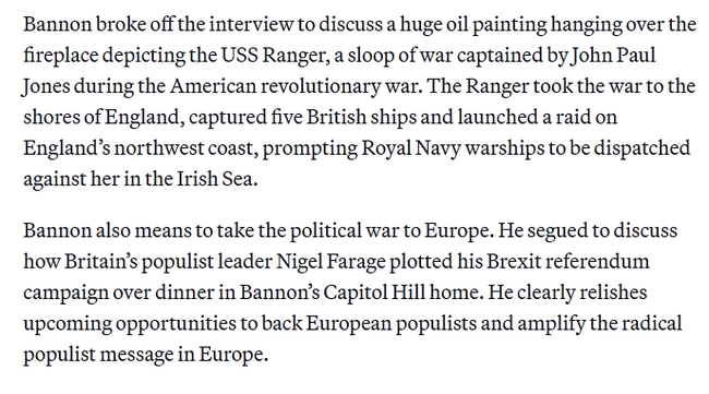 Бэннон прервал интервью, чтобы обсудить огромную картину маслом, висящую над камином, изображающую военный корабль США «Рейнджер», военный шлюп, которым командовал Джон Пол Джонс во время американской революционной войны. Рейнджер перенес войну к берегам Англии, захватил пять британских кораблей и совершил набег на северо-западное побережье Англии, в результате чего военные корабли Королевского флота были направлены против нее в Ирландском море.