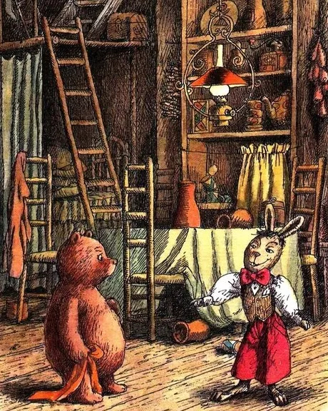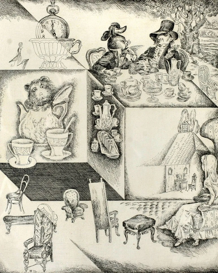«…Когда Кролик вдруг вынул часы из жилетного кармана и, взглянув на них, помчался дальше, Алиса вскочила на ноги. Ее тут осенило: ведь никогда раньше она не видела кролика с часами, да еще с жилетным карманом в придачу! Сгорая от любопытства, она побежала за ним по полю и только-только успела заметить, что он юркнул в нору под изгородью.