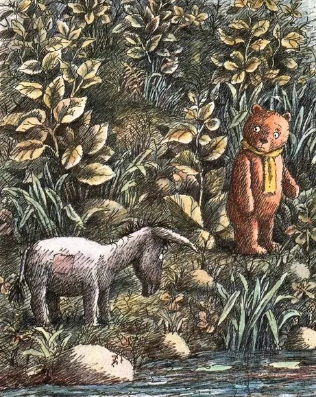 «Винни-Пух первым делом подошел к одной знакомой луже и как следует вывалялся в грязи, чтобы стать совсем-совсем черным, как настоящая тучка. Потом они стали надувать шар, держа его вдвоем за веревочку. И когда шар раздулся так, что казалось, вот-вот лопнет, Кристофер Робин вдруг отпустил веревочку, и Винни-Пух плавно взлетел в небо и остановился там — как раз напротив верхушки пчелиного дерева, только немного в стороне».