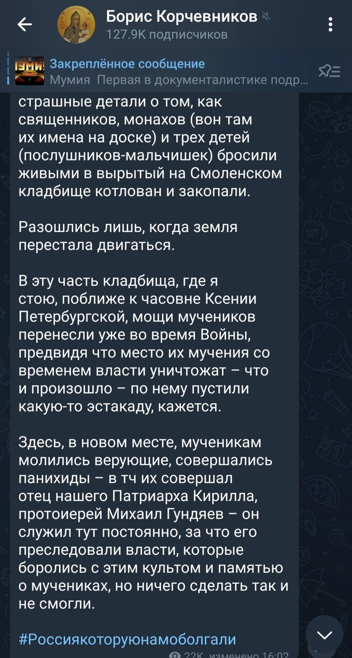 Но народ хранил и передавал из поколения в поколение страшные детали о том, как священников, монахов (вон там их имена на доске) и трех детей (послушников-мальчишек) бросили живыми в вырытый на Смоленском кладбище котлован и закопали.