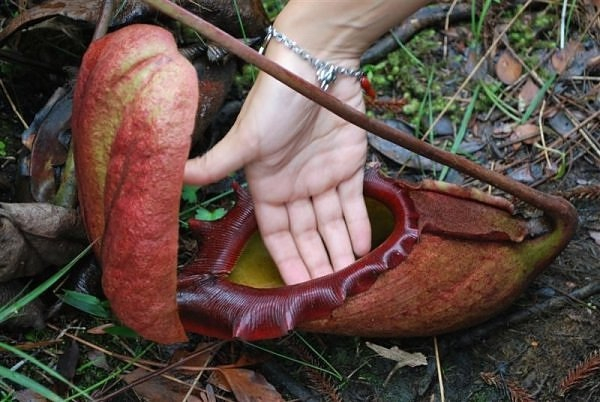 Непентес Раджа (Nepenthes rajah) и правда уникален, но не только потому, что встретить его можно лишь на Борнео. У него огромные кувшины, до 40 сантиметров в длину, и это самые крупные ловушки среди всех растений-хищников на планете. В отличие от более скромных собратьев, в его ловушках порой находят свой конец и мелкие позвоночные, хотя большая часть жертв все еще насекомые. В кувшинах Раджи находили остатки и грызунов, и ящериц, и даже птиц. Объем жидкости в ловушке может достигать иногда и 3,5 л – хватит, чтобы утопить небольшую крысу.