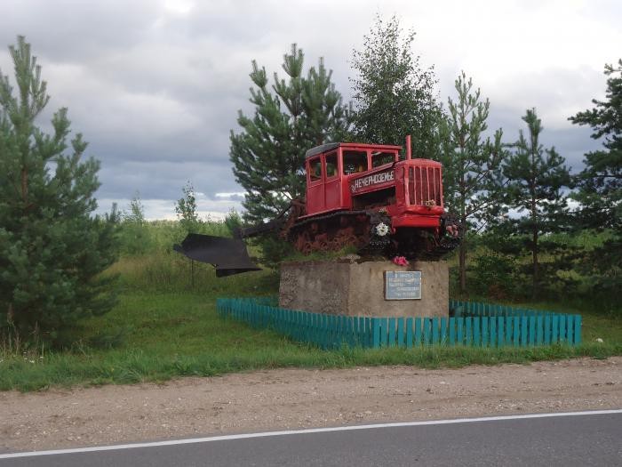 Так, например, на окраине Любытино, в Новгородской области на постаменте установлен трактор, выпускавшийся на Харьковском тракторном заводе в 1930-х годах.