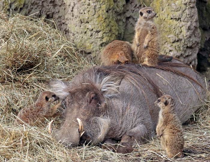 Впрочем, мне все-таки удалось найти фото, где с бородавочниками общаются не мангусты, а сурикаты. Правда, не в природе, а в зоопарке. Какая цель этого общения, неизвестно, но оно вполне напоминает дружбу. Так что создатели мультфильма явно что-то знали.
