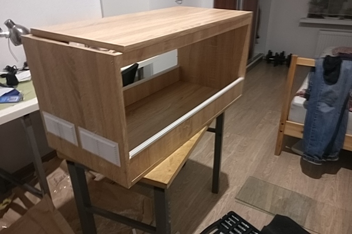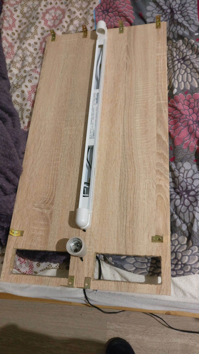Пришлось даже немного паяльником поработать, чтобы приделать выключатель к люминисцентной лампе, так как она оказалась просто с обрезанным проводом... Также у стекольщика были заказаны стекла по размерам из проекта.