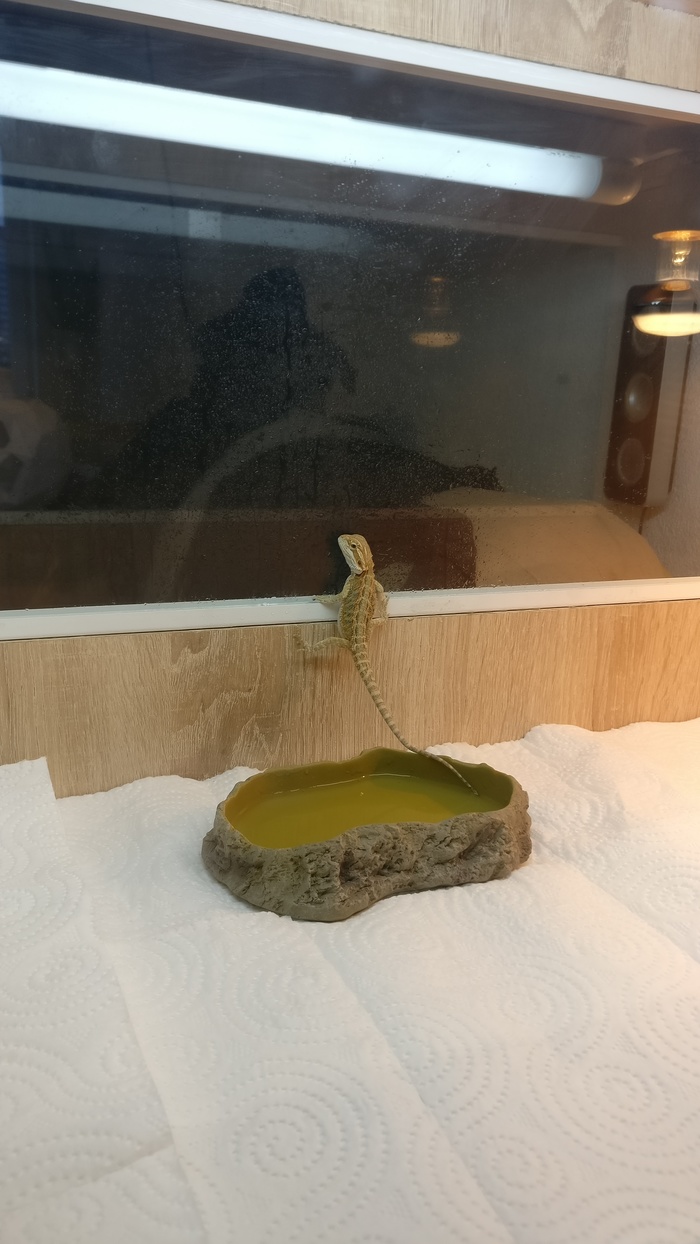 Содержать ящерицу пока она не подрастет было решено на салфетках, потом перейдем на специализированный песок, для этого и делались большие бортики в террариуме. Говорят агамы любят зарываться по шею, поживем увидим этот чудо перископ.