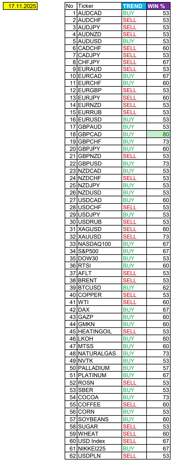 Сезонные тенденции и вероятности на среду 19.11.2025