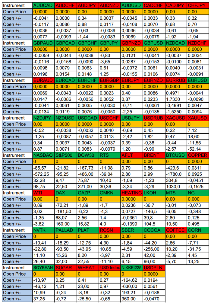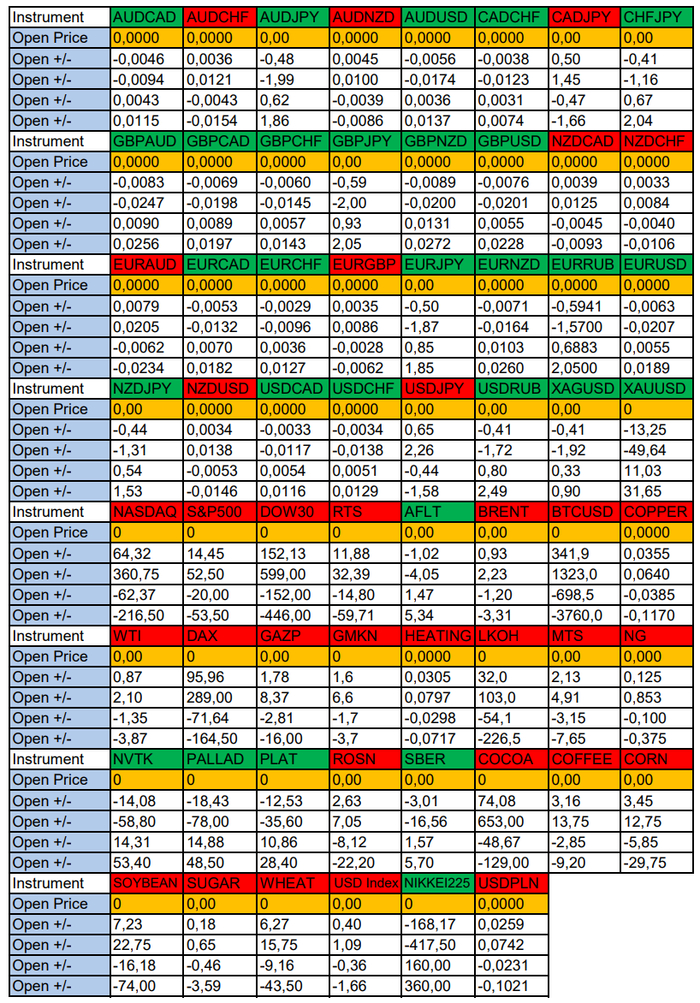 Весь перечень анализируемых активов указан ниже в общем количестве 62 инструмента. Здесь Вы найдете активы рынка Форекс, популярные активы Московской биржи, не менее популярные активы Чикагской биржи СМЕ и мажор криптовалютного сегмента - Биткоин, за которым следуют все альткоины.