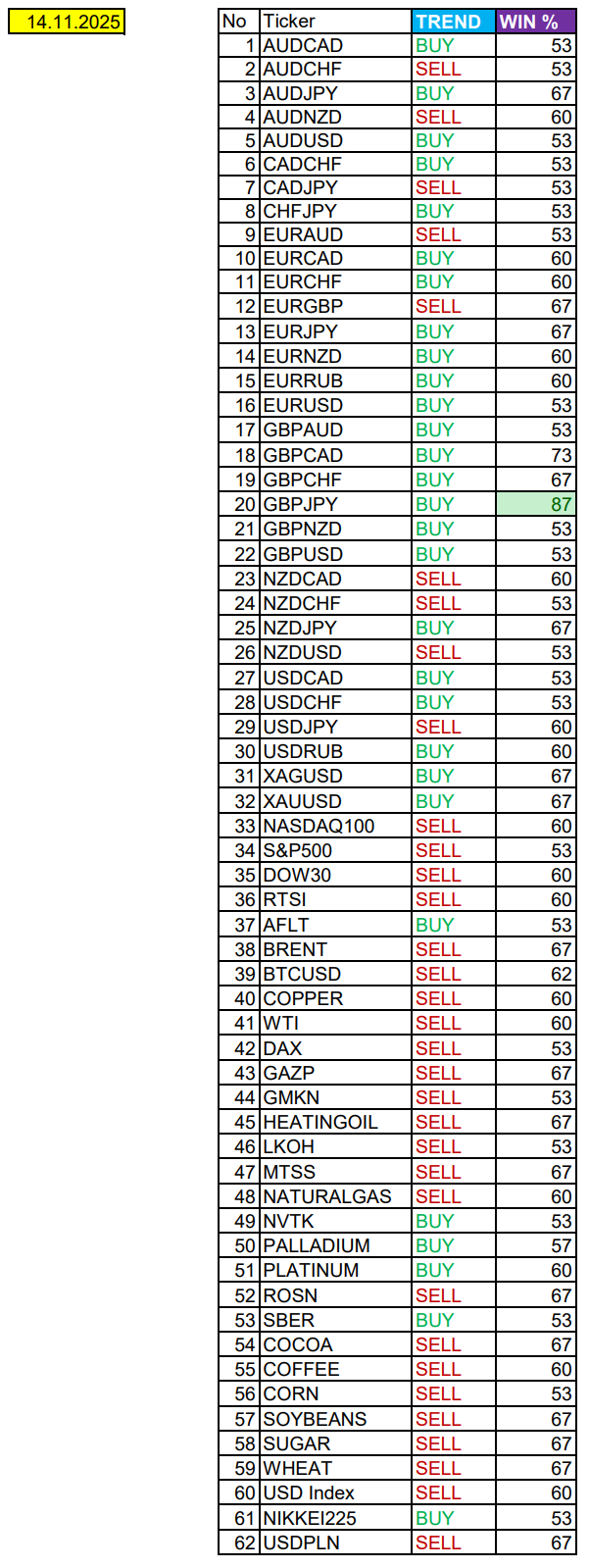 Очередные сезонные тенденции на среду 19 ноября 2025 по основным мажорам финансовых рынков.