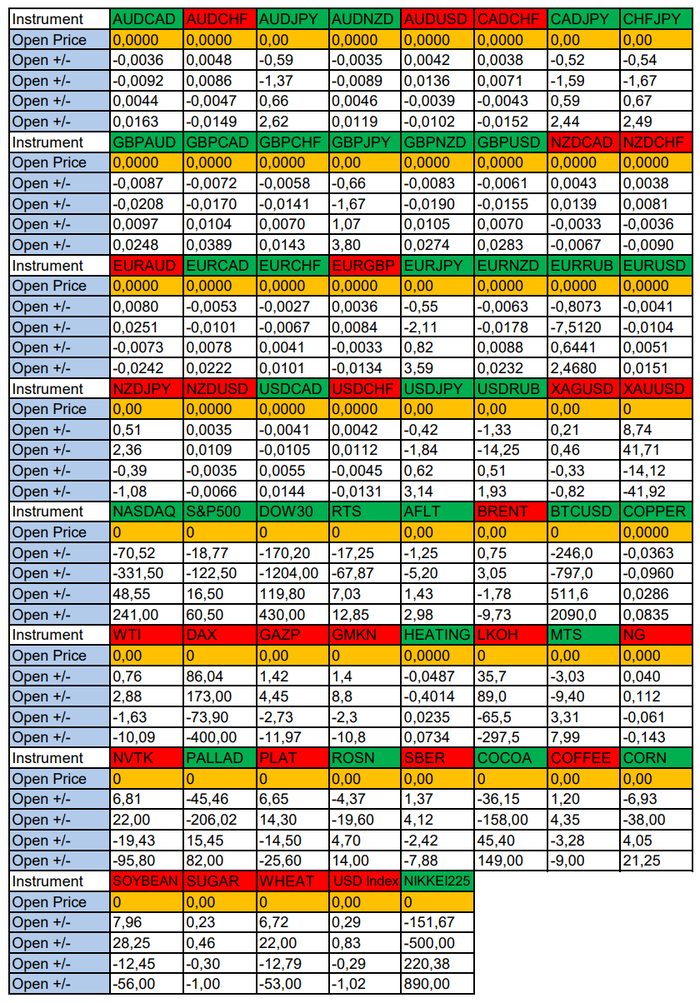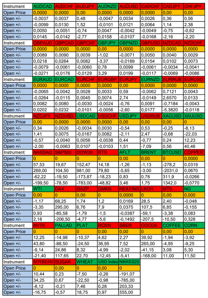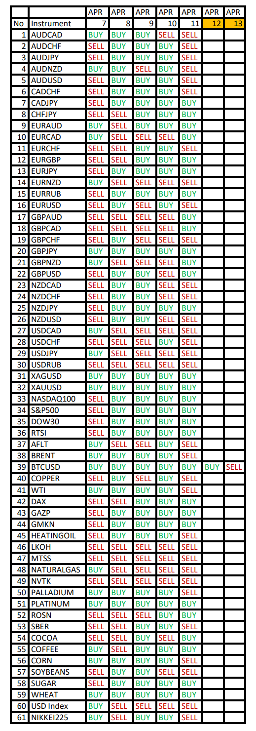 Весь перечень анализируемых активов указан ниже в общем количестве 61 инструмента. Здесь Вы найдете активы рынка Форекс, популярные активы Московской биржи, не менее популярные активы Чикагской биржи СМЕ и мажор криптовалютного сегмента - Биткоин, за которым следуют все альткоины.