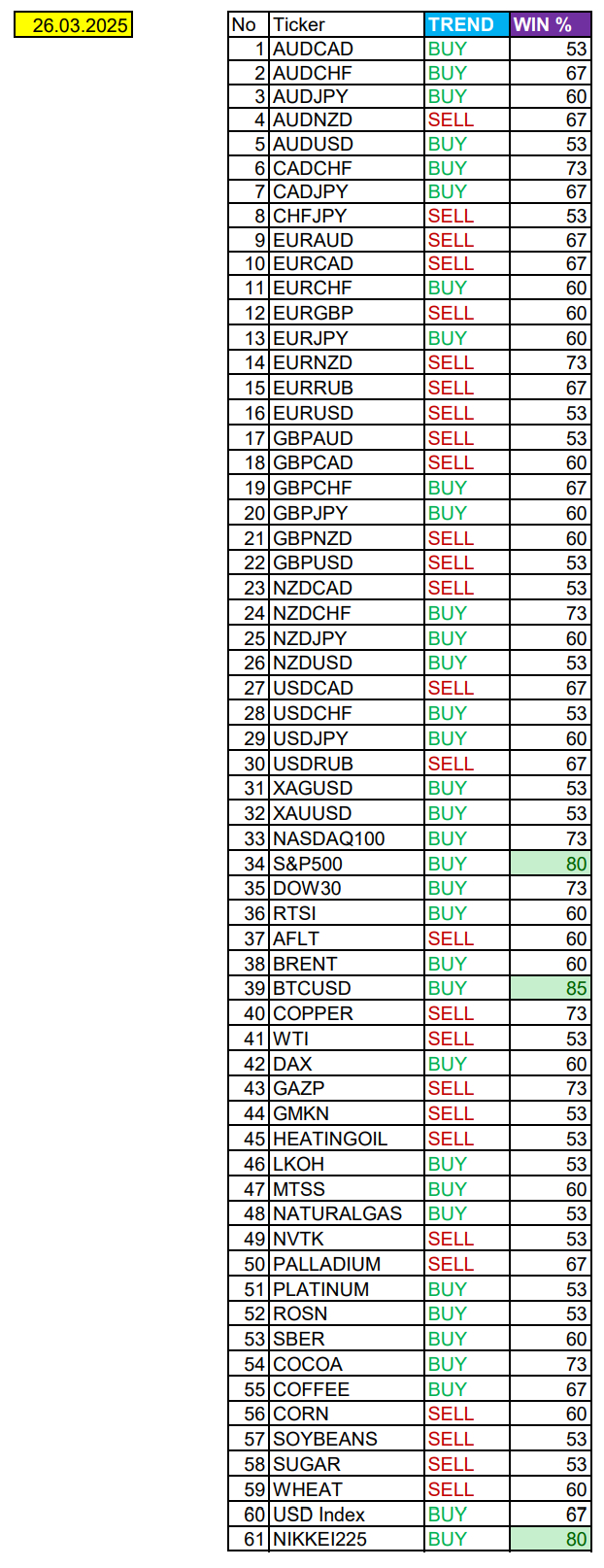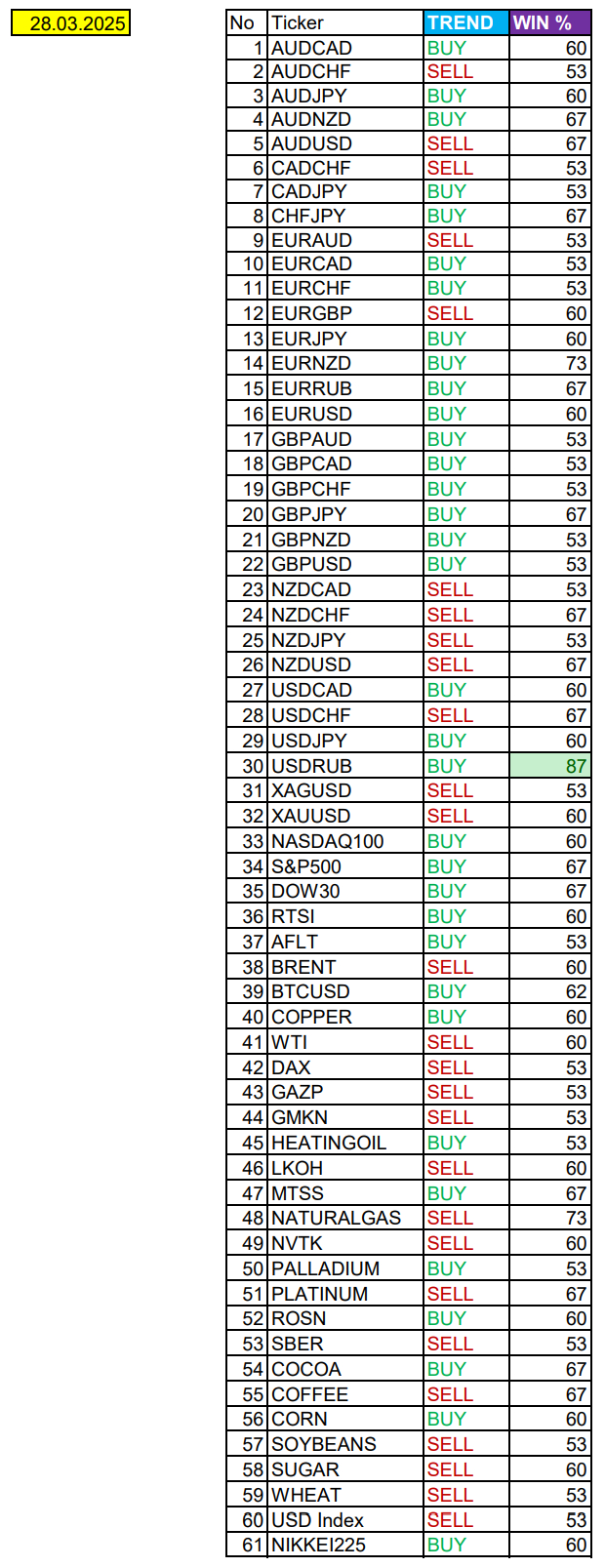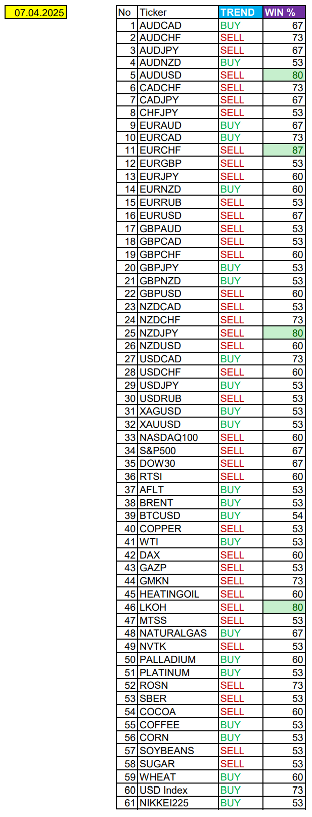 Очередные сезонные тенденции на Понедельник 07 Апреля 2025 по основным мажорам финансовых рынков.