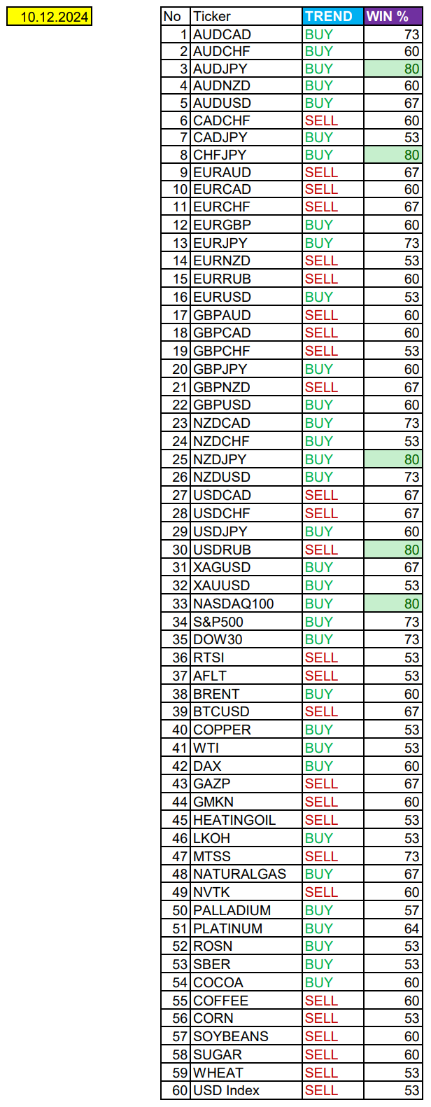 Очередные сезонные тенденции на Среду 11 Декабря 2024 по основным мажорам финансовых рынков.