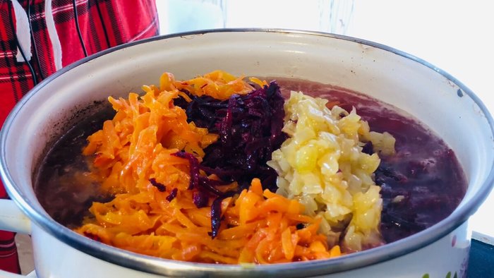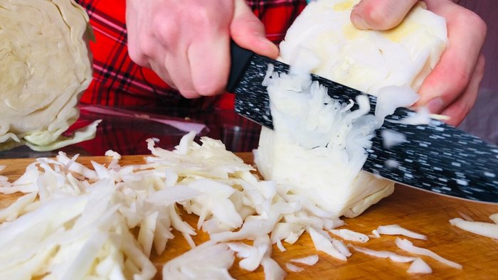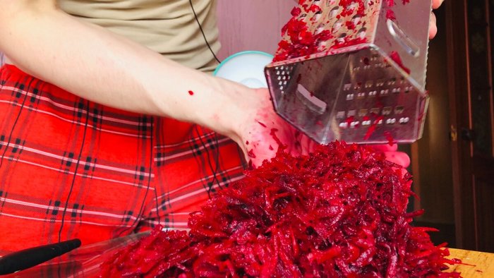 Я люблю мелко покрошенную капусту и натертую свеклу, потому что так у меня делает мама и я так привык делать. Но это не принципиально, свеклу можете порубить на кубики, а капусту крупно покрошить.