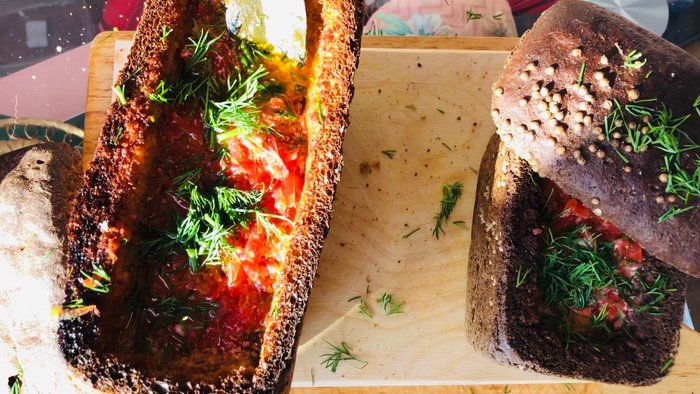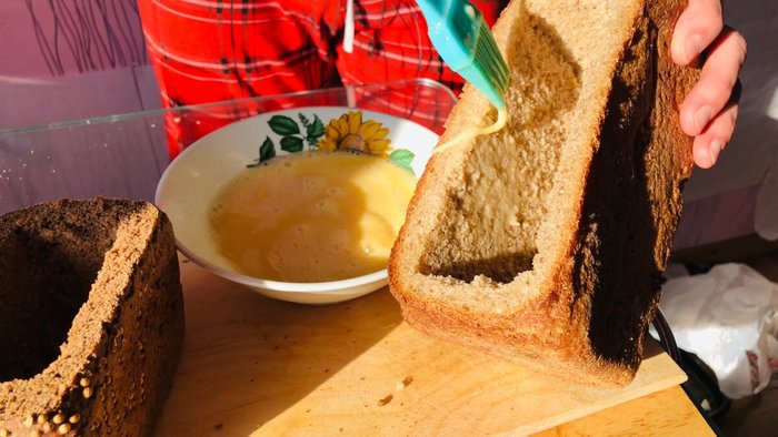 Для этого срежем вершину у хлеба и удалим мякиш. Мякиш плотно прижимаем пальцами. Мы сделали, что то вроде хлебной тарелки или горшочка. Хлеб не должен протечь, но мы перестрахуемся. Взобьем пару яиц, и смажем ими хлеб внутри(все стенки). Смазанную хлебную тарелку отправляем в нагретую духовку до 200-250 градусов. Как яйцо запечется, вынимаем хлеб, снова смазываем и отправляем обратно в духовку. Делаем так 2-3 раза. В результате хлебные стенки окрепнут. Они покроются жесткой яичной коркой.