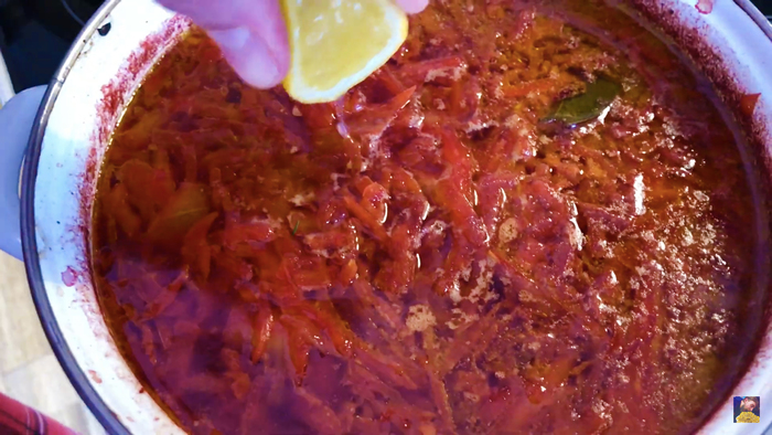 Как бульон закипит, добавляем капусту. После повторного закипания добавляем картошку. Как вода вновь закипит, убавляем огонь до среднего или ниже, в зависимости от того как сильно будет кипеть. Варим 10 минут. Дальше добавляет поджарку(поджаренные свекла, лук и морковь). Тушим суп 5 минут. Далее добавляем лавровый лист, чеснок и свекольный сок(если имеется). Лучше добавьте его в самом конце). Тушим 15 минут. Пробуем суп, если он сладковатый на вкус, добавляем сок лимона. Солим и перчим по вкусу.