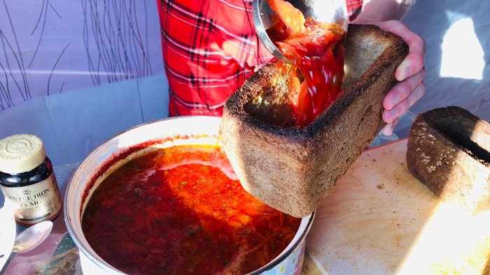 Я здесь вижу только две замены. Это способ приготовления борща и хлеб, в котором подавать борщ. Здесь выбор падает в сторону любимого хлеба.