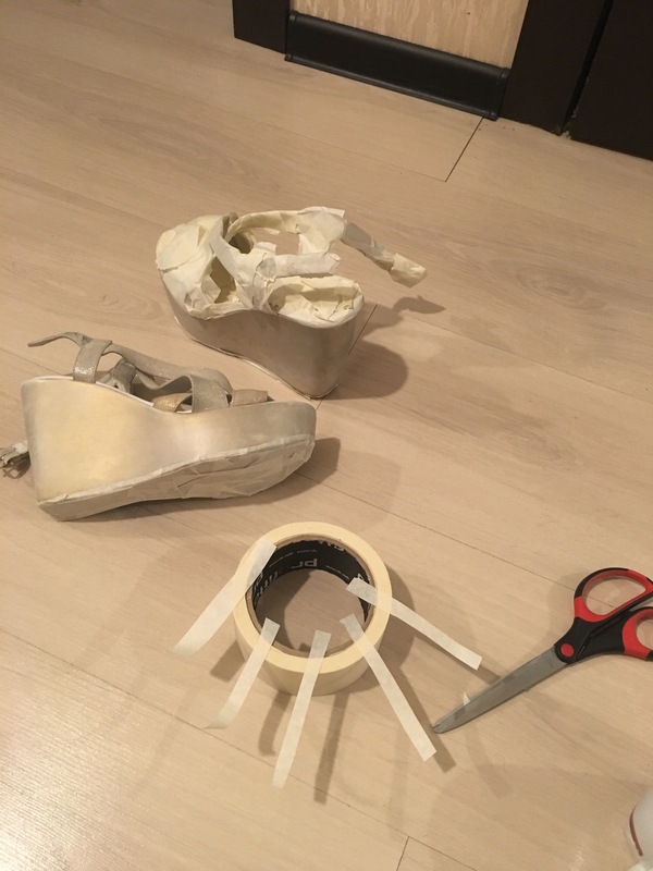 Начинаем с того, что все части обуви, которые мы не красим, мы тщательно заклеиваем бумажным скотчем. С каблуком все просто, с танкеткой придется проявить фантазию.