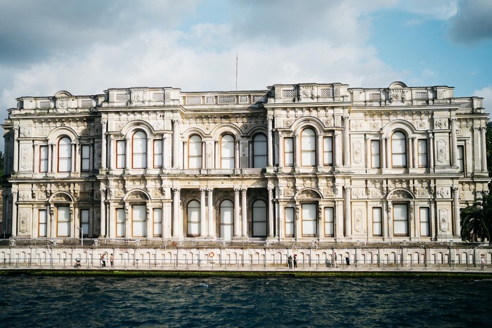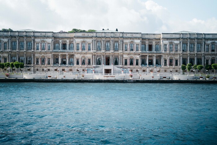 Это Çırağan Palace Kempinski. Это очень качественный новодел. Подлинный дворец султана Абдул-Азиза сгорел зимой 1910 года. И оставалось все это руинами почти 8 десятков лет, до тех пор пока инвесторы из Японии не приспособили его под отель, предварительно восстановив.
