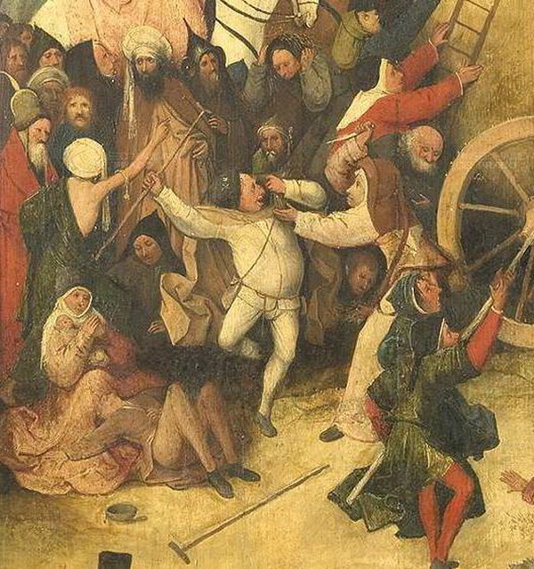 Ниже — простой народ. Мужчина, возможно, пьяный, спит на коленях у женщины с ребёнком.