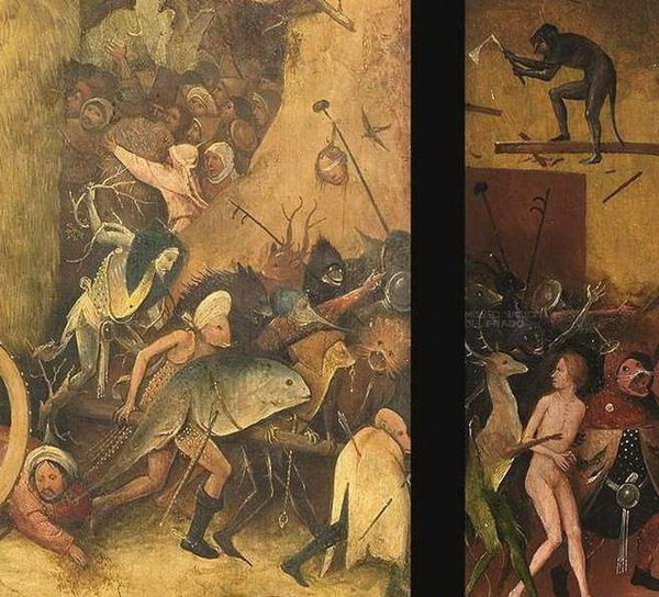Тянут его демоны (справа) с большой рыбой (символ жадности, ненасытности). И тянут прямо к дверям ада.