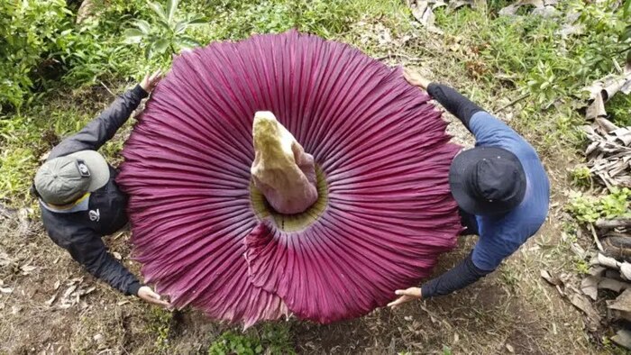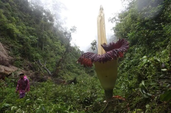 Это самый большой цветок в мире, который может достигать почти трех метров в высоту и полутора метров в диаметре. Под землей скрывается гигантский корень в форме клубня, весом до 50 кг.