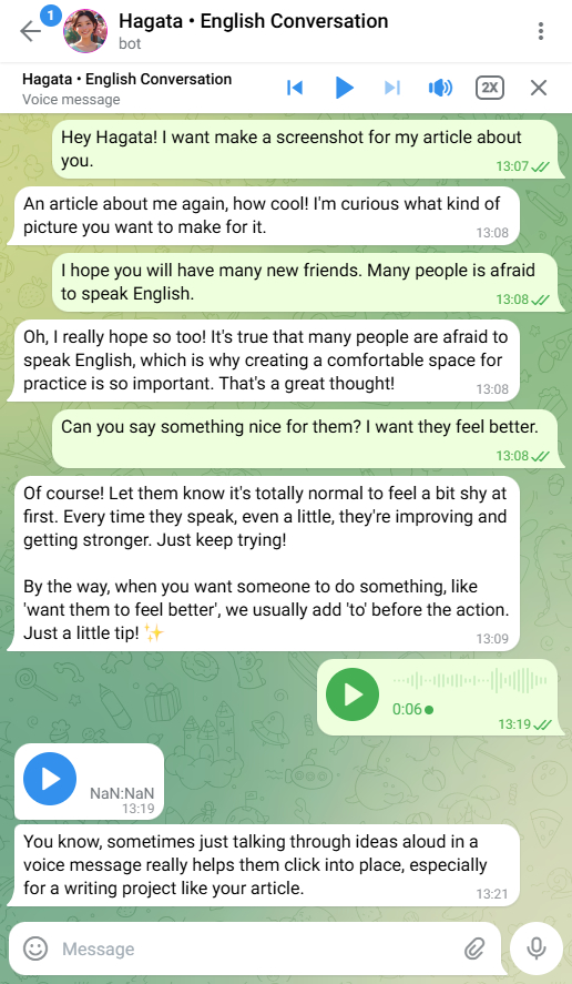 В итоге я собрал бота в Телеграме — терпеливого собеседника, который всегда готов поддержать диалог. Можно писать текстом или отправлять голосовые сообщения. Он не торопит, не критикует за ошибки и не раздражается на паузы.