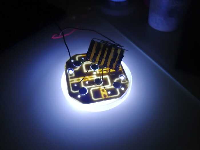 В итоге поместил блок питания, плату с светодиодами и плату с резисторами в один корпус на самодельный радиатор из 7 алюминиевых пластин толщиной 0.5 мм и диаметром 7 см. И все это успешно сгорело разом. Вообще... Это было адское устройство. И так было понятно что сгорит, но я решил узнать когда сгорит. Примерно через 30 мин выгорело разом 3 светодиода из 6.