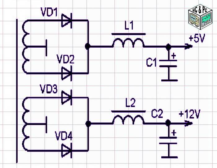 Рис. 2. Схема выпрямителей на вторичных обмотках трансформатора ТПИ-8-1.