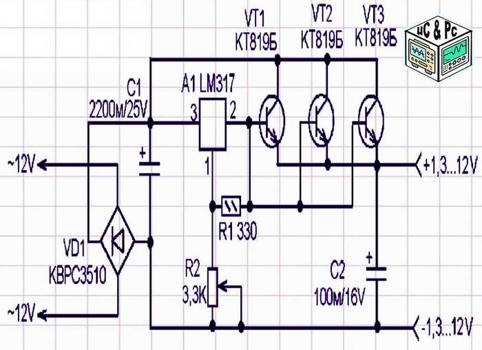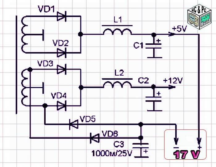 Выпрямляется диодом VD7 и сглаживается конденсатором С5. Режим работы выставляется подстроечным резистором R3. Его регулировкой можно не только достигнуть уверенной работы блока питания, но в некоторых пределах отрегулировать выходное напряжение.