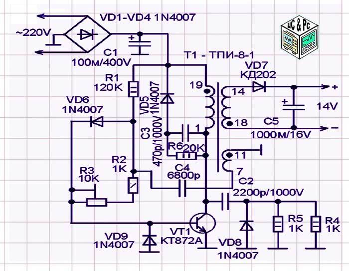 Схема импульсного источника питания для шуруповерта на +14В (КТ872, ТПИ-8-1)