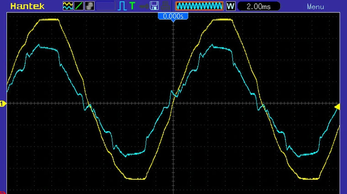 Все это приводит к искажению формы и симметрии синусоидального напряжения в сети. Даже на этой осциллограмме видно, что макушки синусоиды срезаны, и причина этому — как раз неравномерное потребление тока. Это негативно сказывается на работе других электроприборов, для которых «чистый» синус — залог хорошей работоспособности.
